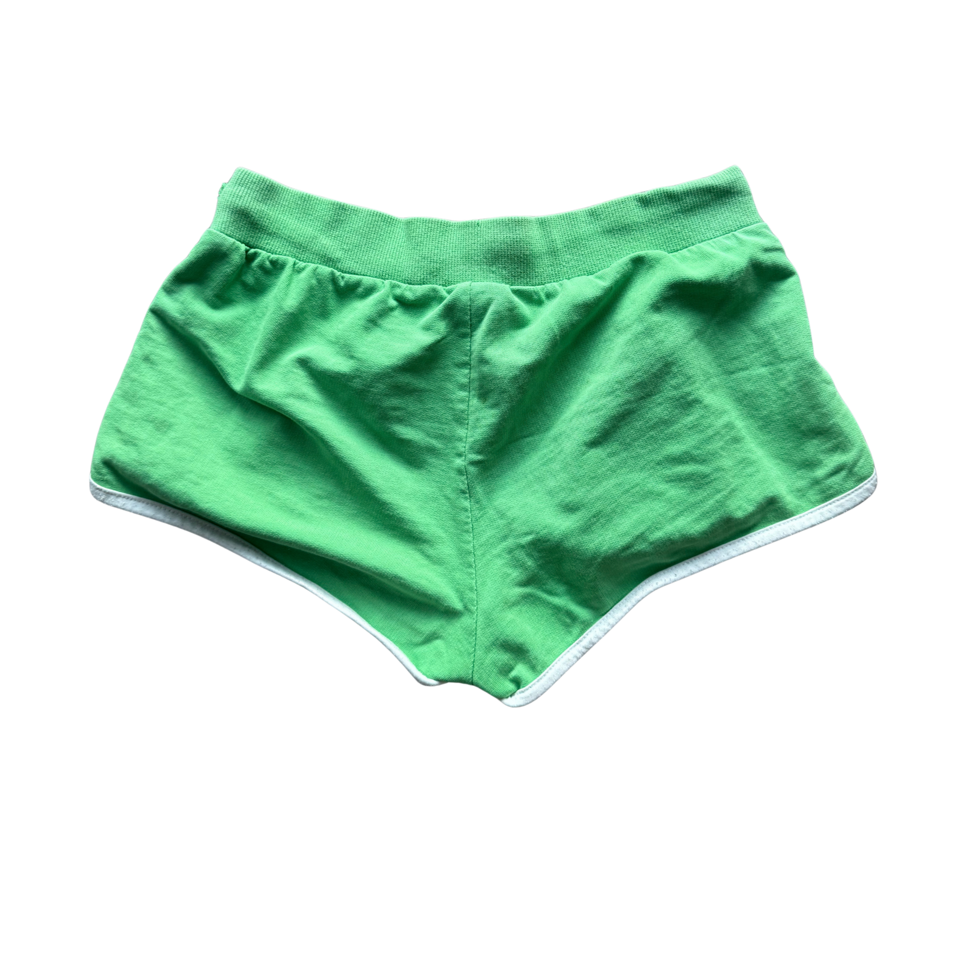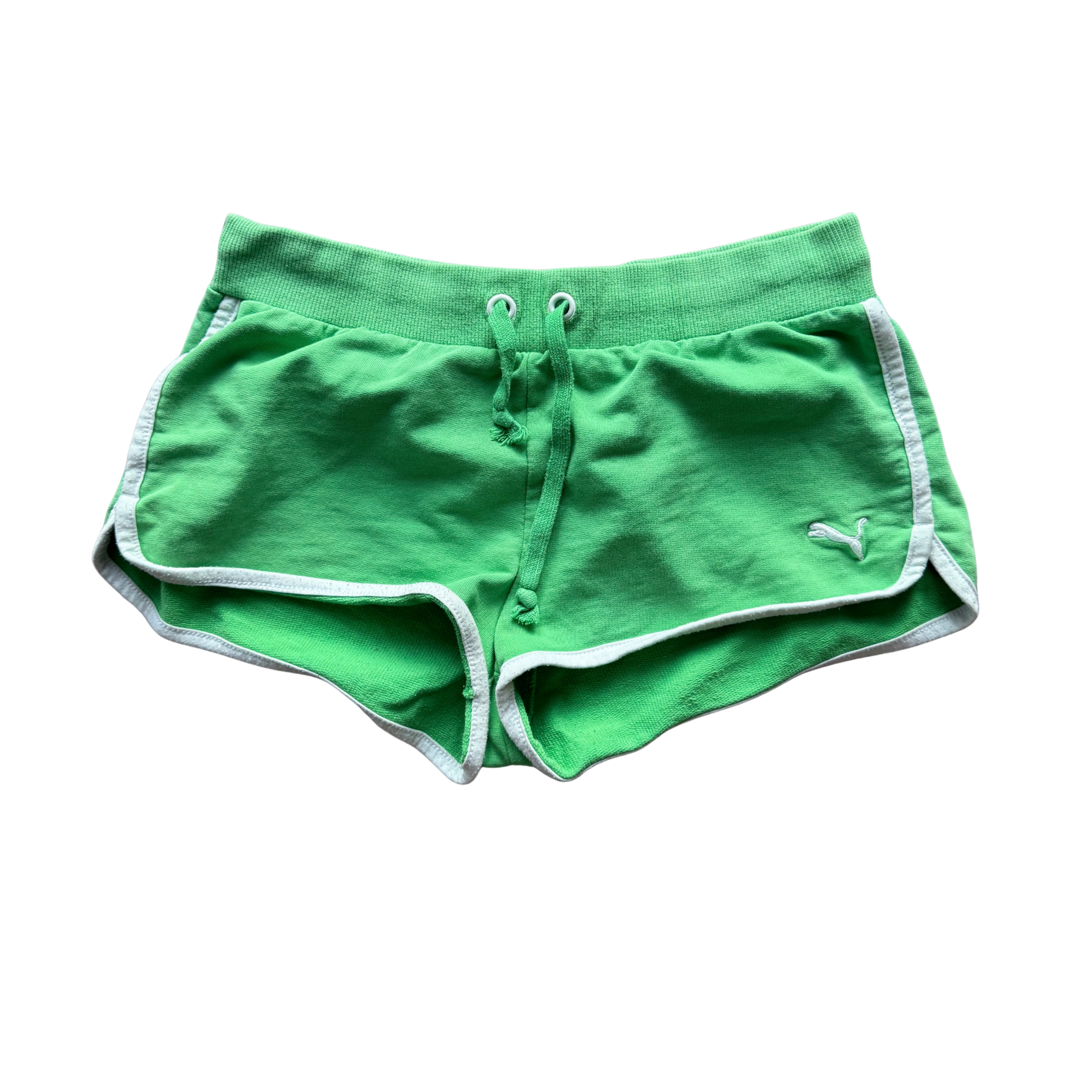 Low-rise vintage Puma sports shorts in a bright green colorway, finished with a white branded label detail.